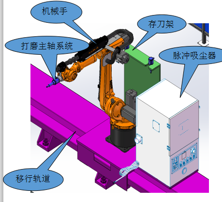 鉆桿焊縫打磨系統(tǒng)主要由變位機裝置,機器人打磨裝置,換刀機構(gòu),安全防護,控制系統(tǒng)等幾部分組成。配有視覺檢測系統(tǒng),打磨過程在線跟蹤檢測。實現(xiàn)在線監(jiān)控打磨,提高打磨質(zhì)量。
