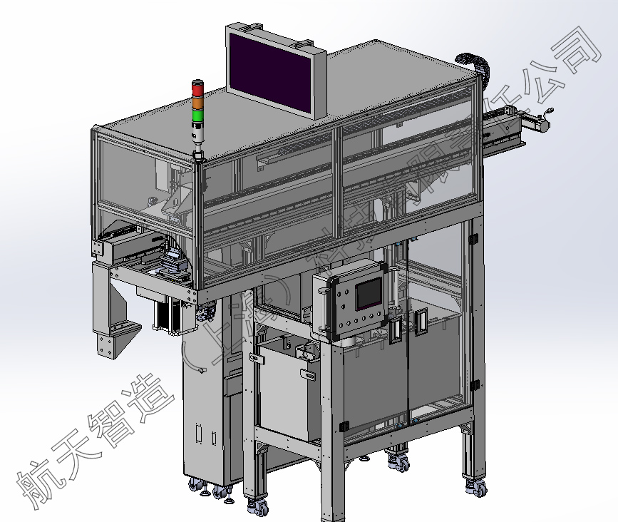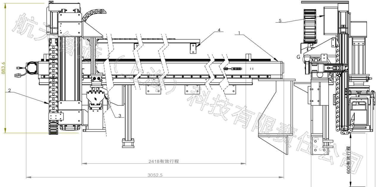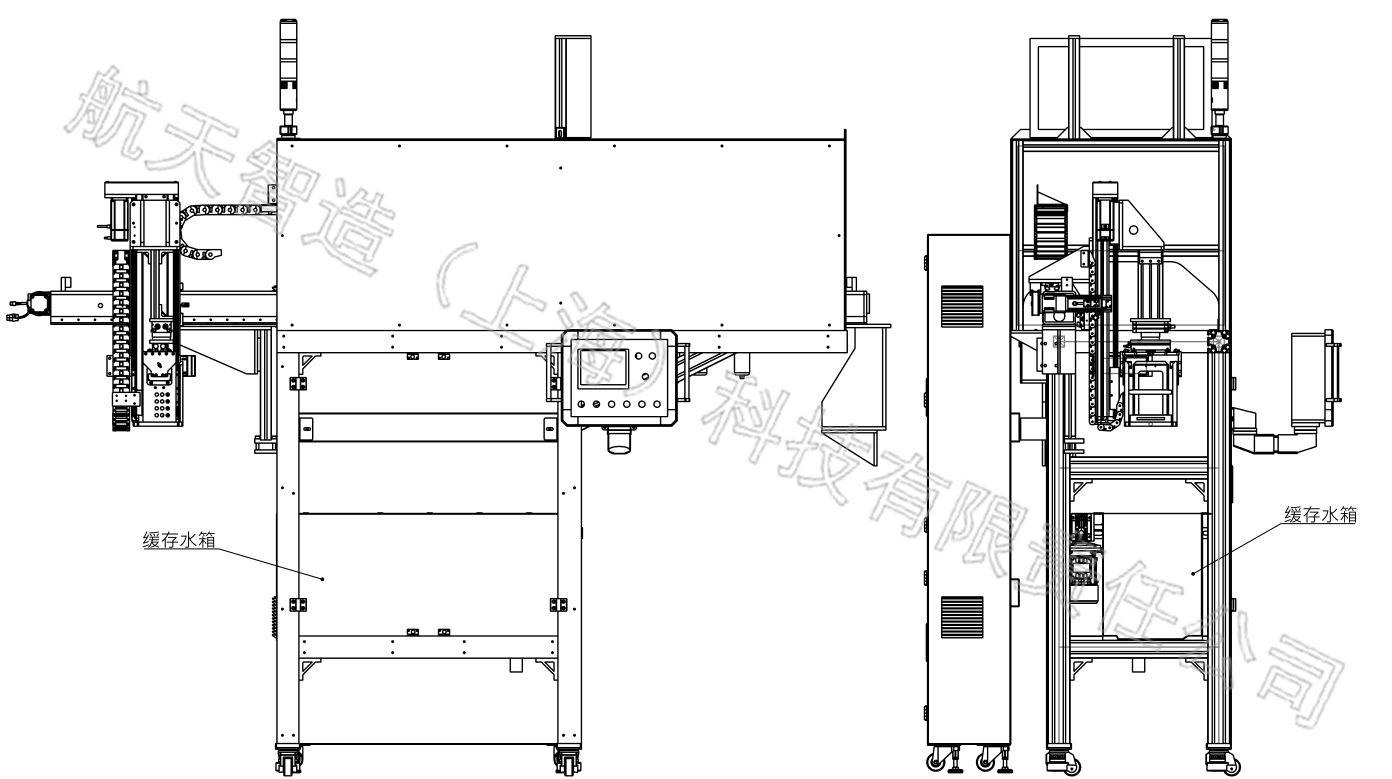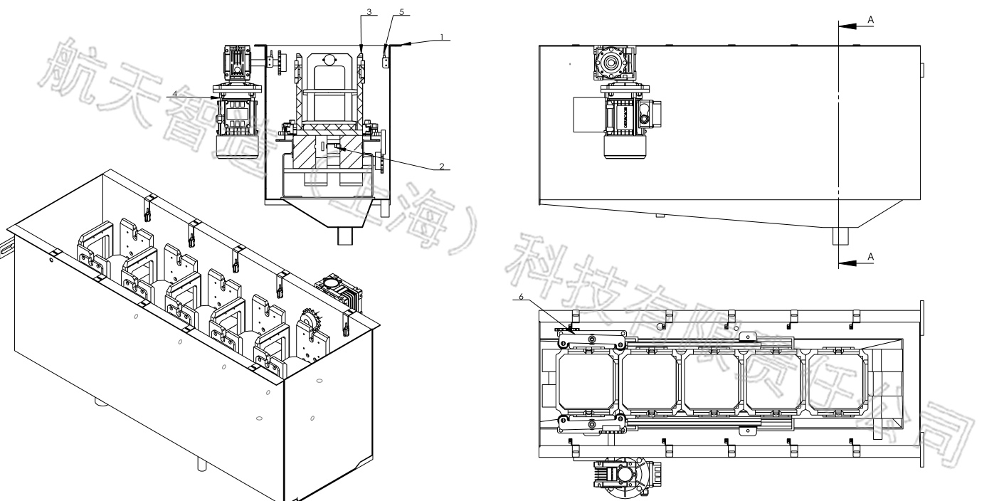 硅片單片很薄、堅(jiān)硬、脆,考慮工況水質(zhì)浸泡的環(huán)境治具要變形小。治具材料采用硬PVC材料阻燃,硬度高,韌性好,吸濕小。按8寸硅片尺寸設(shè)計(jì)內(nèi)框限位,單邊放4mm間隙。承載量為800片硅片設(shè)計(jì)治具高度和承載力,安裝板螺紋底孔內(nèi)嵌螺紋鋼套。底板設(shè)計(jì)清洗分片機(jī)的定位孔,入口孔帶倒角方便引導(dǎo)。底板四角設(shè)計(jì)內(nèi)圓弧角,用于前后治具跟進(jìn)時(shí)的隔斷。左右側(cè)板設(shè)計(jì)機(jī)械手抓取前的限位導(dǎo)向,當(dāng)機(jī)械手下降時(shí)自動(dòng)導(dǎo)正治具后到位抓取。斜度板設(shè)計(jì)角度符合清洗分片的角度。抓板設(shè)計(jì)同時(shí)滿足人工和機(jī)械手搬運(yùn)。后板設(shè)計(jì)要挖空,方便人工放置硅片操作。后板并設(shè)計(jì)有RFID芯片安裝位。 圖二硅片載體治具示意圖 1.底板 2.側(cè)板3.斜度板4.抓板5.后板 機(jī)械手設(shè)計(jì) 機(jī)械手系統(tǒng)由氣動(dòng)控制組件、接線盒、三色燈報(bào)警器、LED顯示器、機(jī)架框架、機(jī)械手桁架組件、觸摸屏控制組件、保護(hù)罩殼、控制電箱、治具緩存水箱組成。如圖三所示。氣動(dòng)控制組件和接線盒方便于能源接入。三色燈報(bào)警器時(shí)時(shí)動(dòng)態(tài)顯示設(shè)備狀態(tài),便于維護(hù)。LED顯示器主要顯示設(shè)備的料號(hào)信息。機(jī)架框架設(shè)計(jì)滿足機(jī)械手桁架組件和治具緩存水箱的安裝和承載??蚣苤С懈叨燃骖櫇M載治具輸送、治具緩存水箱、清洗分片位、空治具回流輸送功能需求。機(jī)械手桁架組件設(shè)計(jì)滿足硅片滿載治具的輸送、緩存、清洗分片位的上料、空治具回的流橫移和上下料的承載、行程。觸摸屏控制組件設(shè)計(jì)有自動(dòng)和手動(dòng)模式,方便調(diào)試、維護(hù)、管理。保護(hù)罩殼將機(jī)械運(yùn)動(dòng)機(jī)構(gòu)做安全防護(hù),防止意外。治具緩存水箱設(shè)計(jì)防止一刀料全部到齊,造成輸送線體堵車作為緩存。緩存位物料少于2件時(shí)啟動(dòng)叫料考慮中間環(huán)節(jié)備料時(shí)間。 圖三機(jī)械手系統(tǒng)示意圖 1.氣動(dòng)控制組件2.接線盒3.三色燈報(bào)警器4.LED顯示器5.機(jī)架框架6.機(jī)械手桁架組件7.觸摸屏控制組件8.保護(hù)罩殼9.控制電箱10治具緩存水箱 (1)桁架機(jī)械手組件設(shè)計(jì) 桁架機(jī)械手由橫移移栽模組、垂直移栽模組、機(jī)械手組件、拖鏈組件、接線盒組成。如圖四所示。橫移移栽模組行程滿足現(xiàn)場(chǎng)布局,移栽橫移位涉及滿載治具輸送、治具緩存水箱、清洗分片位、空治具回流輸送的精確位置,采用伺服電機(jī)驅(qū)動(dòng)。移載行程范圍內(nèi)設(shè)計(jì)零點(diǎn)、左右兩邊的極限位、中間設(shè)置加減速感應(yīng)位。橫梁采用型材鋼結(jié)構(gòu),導(dǎo)軌安裝為T型安裝方式,安裝面貼板焊接加工保持平行度和垂直度。移栽極限位設(shè)計(jì)機(jī)械硬限位。牽引方式采用皮帶。 圖四桁架機(jī)械手示意圖 1.橫移移栽模組2.垂直移栽模組3.機(jī)械手組件4.拖鏈組件5.接線盒 垂直移栽模組高度行程涉及滿載治具輸送、治具緩存水箱、清洗分片上料位、空治具回流輸送系統(tǒng)。設(shè)計(jì)時(shí)除清洗分片上料位高度外,其余高度設(shè)計(jì)一致。高度的行程以最低點(diǎn)容許富余量50mm。由于高度不同垂直提升采用抱閘伺服電機(jī)驅(qū)動(dòng)。提升機(jī)構(gòu)設(shè)計(jì)為導(dǎo)軌滑塊和滾珠絲桿方式。移載行程范圍內(nèi)設(shè)計(jì)零點(diǎn)、上下兩邊的極限位、中間設(shè)置加減速感應(yīng)位。 (2)治具緩存水箱設(shè)計(jì) 治具緩存水箱放置在機(jī)械手橫移框架內(nèi)并固定。如圖五所示。緩存水箱的線體中心位置與機(jī)械手移載中心位置重合。機(jī)械手將輸送線體的滿載治具緩存在水箱中。治具緩存水箱由水箱本體、水下輸送線體、物料檢測(cè)、截停機(jī)構(gòu)組成。 圖五緩存水箱安裝位示意圖 水箱材料采用不銹鋼鈑金,拼接焊接而成密封不能漏水。水箱設(shè)計(jì)有進(jìn)水口和排水口方便水定時(shí)更換且設(shè)有液位傳感器。水箱外有與框架固定的安裝板。水箱內(nèi)安裝有輸送線體,用于輸送治具。水箱上料位設(shè)計(jì)有料感應(yīng),感應(yīng)有料啟動(dòng)輸送。水箱內(nèi)可以緩存4個(gè)治具位置加1個(gè)放料位滿足5個(gè)治具位置尺寸空間。每處位置都有有料感應(yīng),防止?jié)M料放料或疊料。輸送前端設(shè)計(jì)有截停機(jī)構(gòu),當(dāng)治具到上料抓取位時(shí)截停機(jī)構(gòu)啟動(dòng)阻斷緊跟后面的治具,防止抓取提升帶起。 圖六緩存水箱結(jié)構(gòu)示意圖 1.水箱本體2.水下輸送線體3.治具4.輸送驅(qū)動(dòng)5.物料檢測(cè)6.截停機(jī)構(gòu)治具 03 推 廣 前 景 和 結(jié) 論 本文設(shè)計(jì)的一款硅片載體治具自動(dòng)上料機(jī)械手,在整體車間13條清洗線實(shí)施后,硅片脫膠和清洗前的分裝、搬運(yùn)、分配、上料環(huán)節(jié)中實(shí)現(xiàn)了僅在硅片脫膠后往治具分裝硅片需人工作業(yè),大大減輕了勞動(dòng)強(qiáng)度。不同型號(hào)的硅片清洗對(duì)應(yīng)的不同清洗設(shè)備可以在產(chǎn)線中實(shí)現(xiàn)自動(