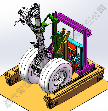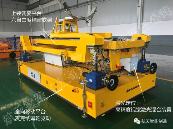 該項目為某大型客機專門定制的起落架安裝裝置,采用麥克納姆輪做為移動機構(gòu)可任意方向高精度的移動,配置六自由度調(diào)姿機構(gòu)完成精確安裝對接。全向移動平臺采用我司成熟的麥克納姆輪技術(shù),能夠?qū)崿F(xiàn)高精度、零回轉(zhuǎn)半徑的全向移動,由于在起落架安裝環(huán)節(jié)現(xiàn)場空間比較小,裝配環(huán)境復雜,用麥克納姆輪組作為移動機構(gòu)可以完全解決這個問題;調(diào)姿部分以伺服電機控制用于實現(xiàn)精確的六自由度調(diào)姿,以便于在起落架安裝時實時精準的調(diào)整安裝位置。