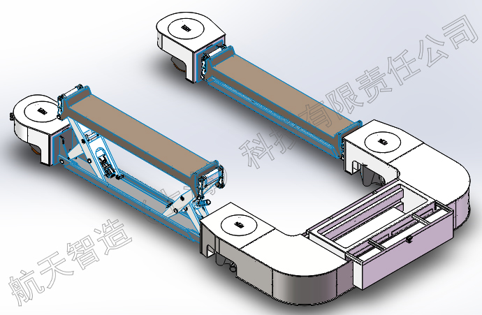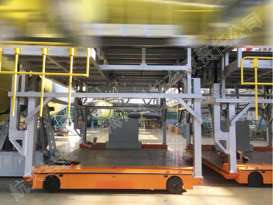 機塢AGV平臺的設(shè)計制造可以滿足飛機總裝生產(chǎn)過程中,機頭、機身、機翼及尾段各部位的安裝工作,為操作人員提供高空作業(yè)工作平臺,根據(jù)工作需要電控移動和改變升降高度對整機進行工作平臺的設(shè)計;整體工作平臺分為:雷達艙工作梯、風擋雨刷工作、機翼工作平臺、尾段工作平臺、罩體工作平臺、前登機門工作、前應(yīng)急門登機、后登機門登機、起落架工作梯、機艙內(nèi)工作梯,所有工作平臺入位后對合包圍飛機,機翼平臺分為三段,采用我司自主研發(fā)的三車聯(lián)動控制來實現(xiàn)整體或分段的移動,平臺上集成生產(chǎn)用工具、物料放置架、生產(chǎn)所需動力源、數(shù)據(jù)源接口、垃圾投放通道等功能。大翼和尾段工作平臺采用全向輪移動,所有工作平臺根據(jù)現(xiàn)有廠房尺寸合理布局,能快速移動,方便飛機進出機庫。